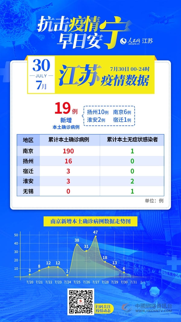 人民网南京7月31日电 (萧潇)据江苏卫健委消息,7月30日0-24时,江苏新增本土确诊病例19例(南京市报告6例;淮安市报告2例,其中1例为无症状感染者转为确诊病例;扬州市报告10例;宿迁市报告1例),7例为轻型,12例为普通型。以上病例均在定点医院隔离治疗。当日全省解除医学观察的境外输入无症状感染者1例。